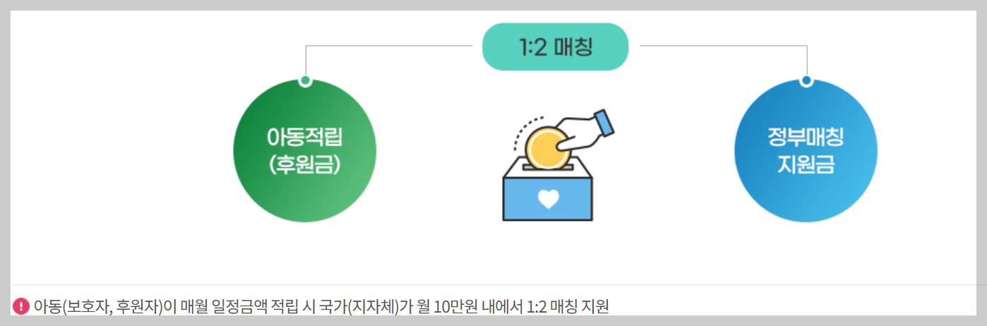 적립 구조는 아동이나 보호자가 매월 최대 5만 원까지 저축하면, 정부가 1대 2 비율로 최대 10만 원을 매칭 지원합니다.