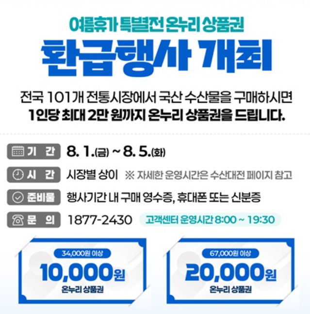단 5일간만 진행되는 ‘여름휴가 특별전’ 온누리상품권 환급행사는 한정 기간, 한정 수량으로 운영됩니다.