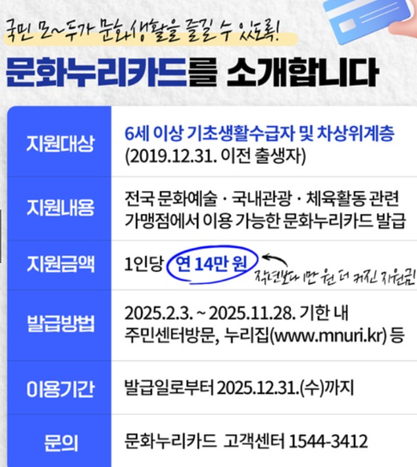 바로 기초생활수급자와 차상위계층을 대상으로 제공되는 ‘문화누리카드’입니다.