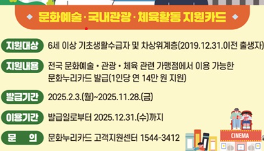 기초생활수급자와 차상위계층에게 연간 일정 금액을 지원하는 통합문화이용카드입니다.