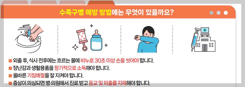 - 수족구 의심 증상이 나타날 경우 신속히 병의원 진료 후, 등원·등교 자제