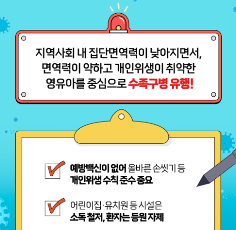 수족구병(Hand Foot and Mouth Disease) 에 대한 각별한 주의가 필요합니다.
